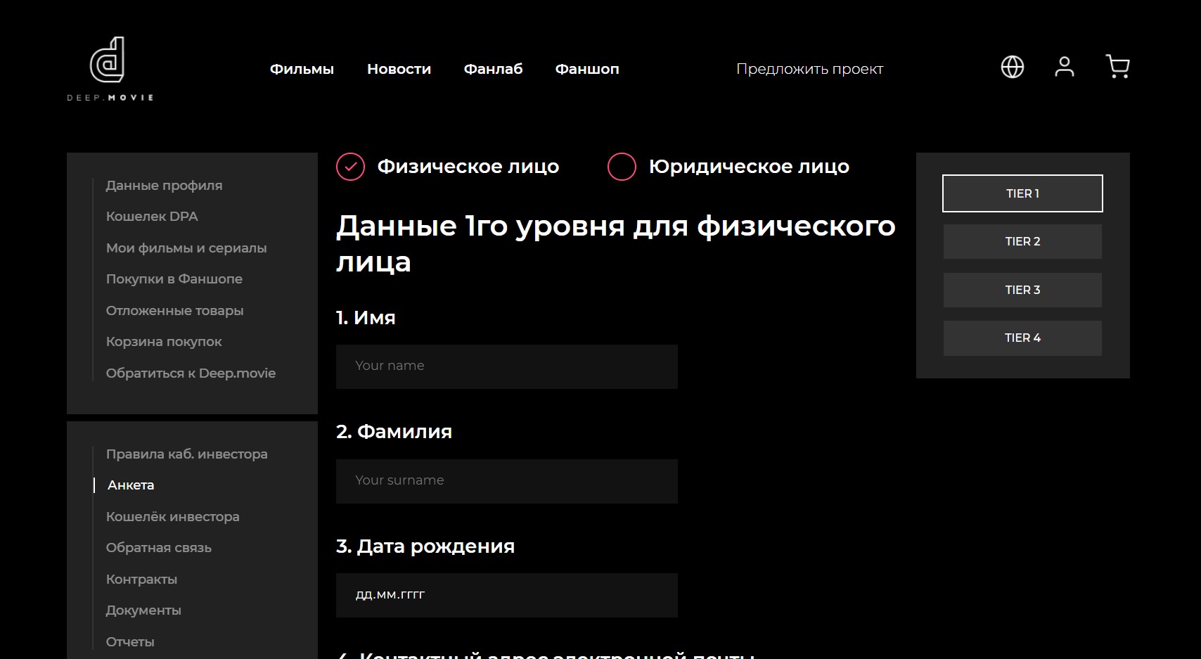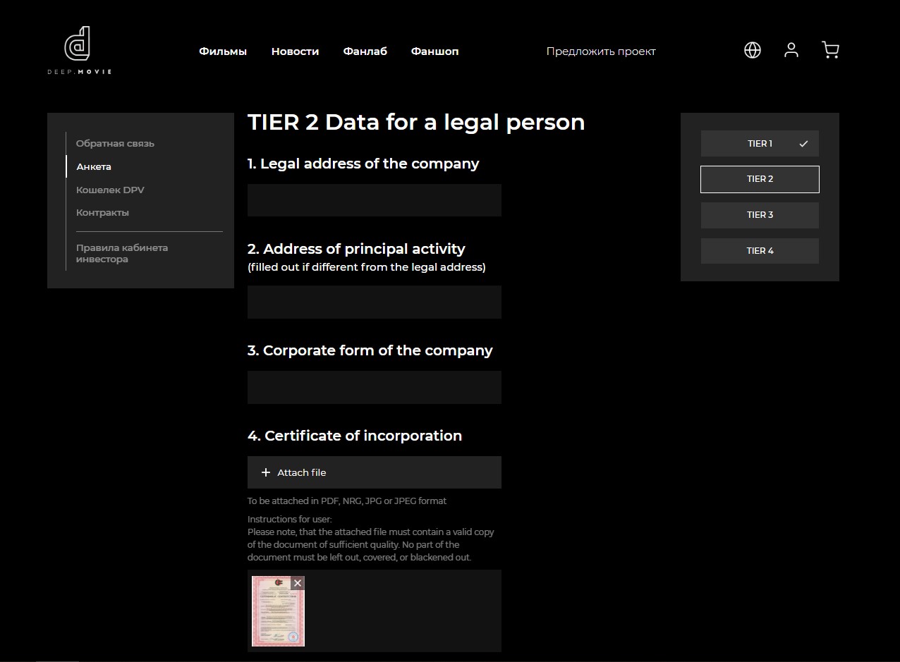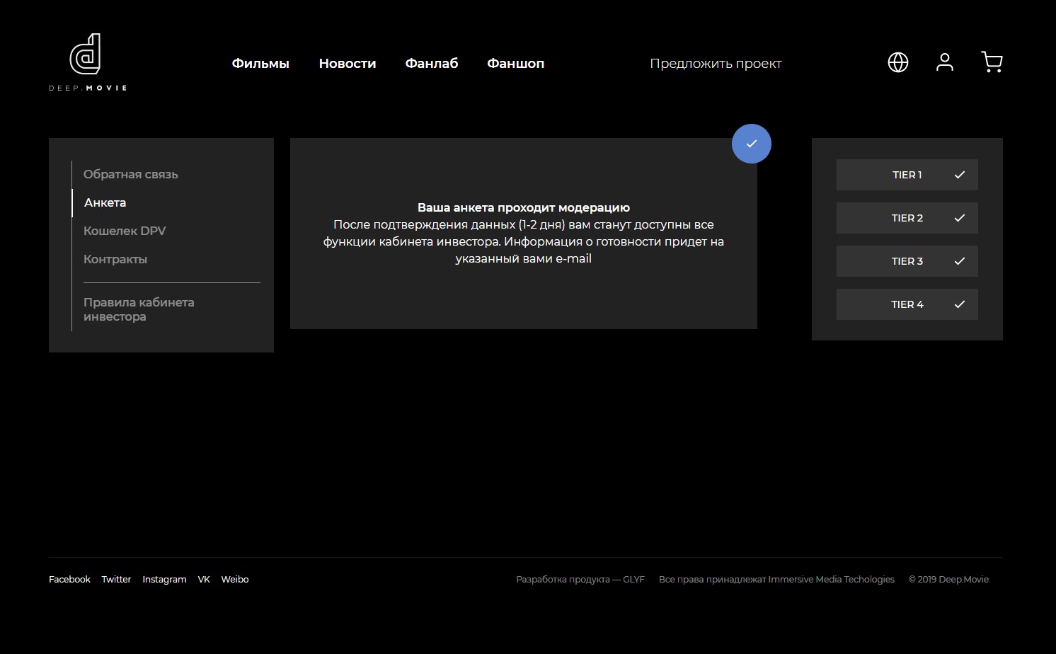 Deep.movie – первый в мире кросс-платформенный видеосервис иммерсивных фильмов и сериалов имеет собственное, уникальное производство. А так же платформа Deep.vote - сервис инвестирования. Участие в разработке по блокчейн части проекта, интеграции с сервисом каталога фильмов, создание функционала по регистрации, анкетированию пользователей, личного кабинета инвестора: дизайн, верстка и backend. Более подробно о собственнике и самом проекте можно ознакомится на сайте заказчика: