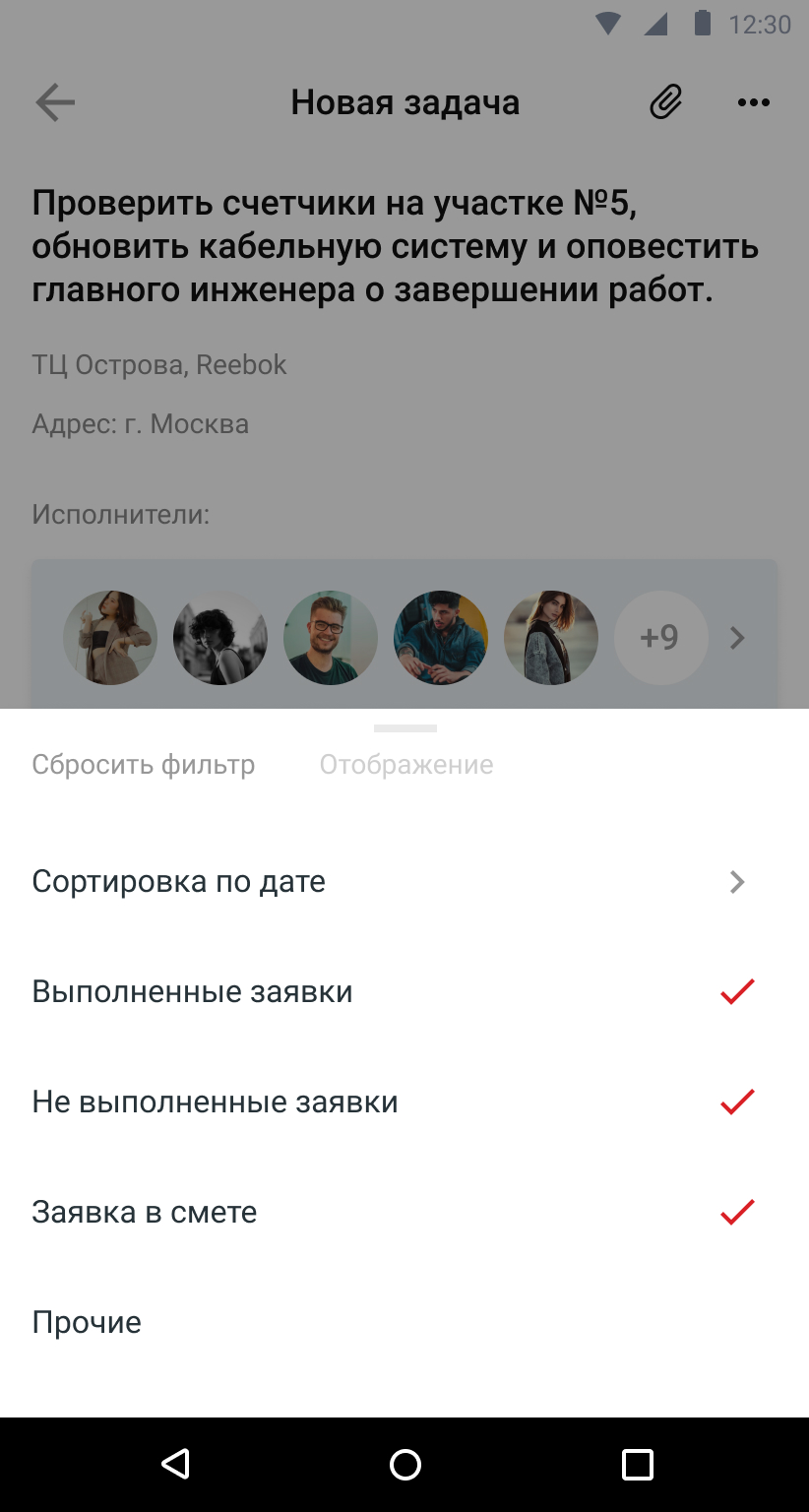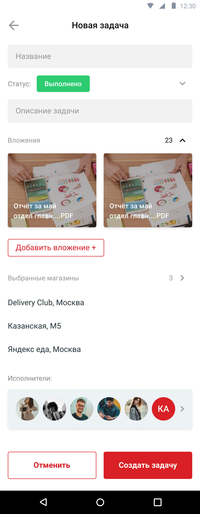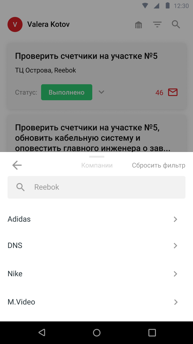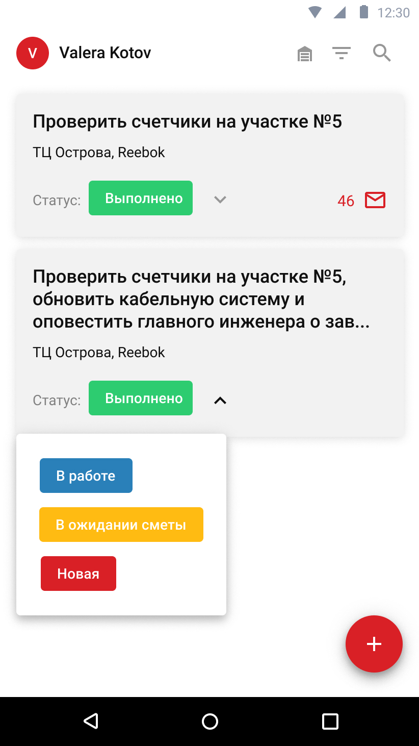 Само приложение отображает короткие карточки с название заявки, ниже отображает магазин и компанию в одной строке, отобразить статус заявки и дает возможность отредактировать статус с помощью выпадающего списка.